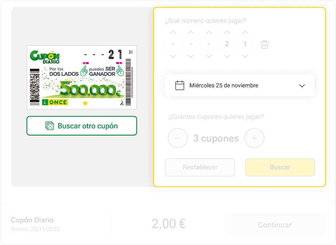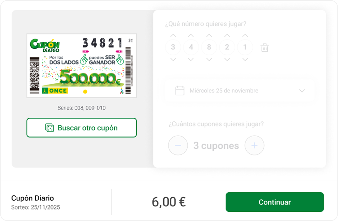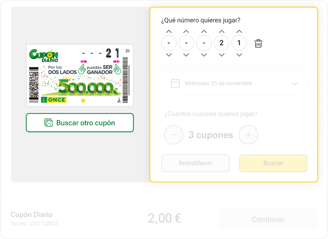 Podrás comprar el Cupón Diario en Internet a través de JuegosONCE, web oficial de venta de lotería de la ONCE. Podrás comprar a cualquier hora del día y desde cualquier dispositivo, estés donde estés. También podrás comprar el Cupón Diario en los kioskos de la ONCE y sus puntos de venta en calle.