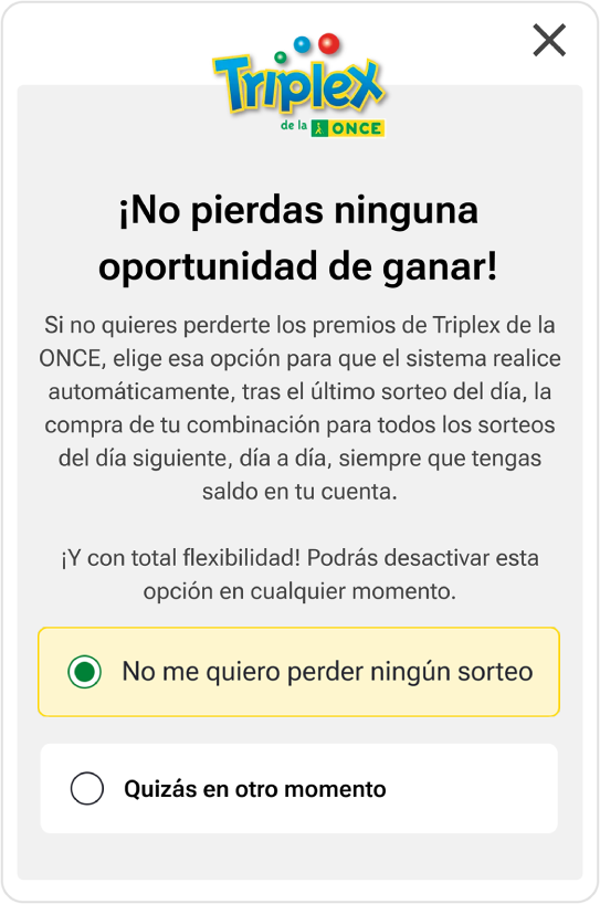 Al comprar tu Triplex de la ONCE, si seleccionas comprar más de 1 sorteo consecutivo, participarás en tantos sorteos consecutivos como hayas seleccionado, a partir del siguiente sorteo disponible.